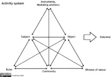 Activity theory is more of a descriptive meta-theory or framework than a predictive theory. It considers an entire work/activity system (including teams, organizations, etc.) beyond just one actor or user. It accounts for environment, history of the person, culture, role of the artifact, motivations, and complexity of real-life activity. One of the strengths of AT is that it bridges the gap between the individual subject and the social reality—it studies both through the mediating activity. The unit of analysis in AT is the concept of object-oriented, collective and culturally mediated human activity, or activity system. This system includes the object (or objective), subject, mediating artifacts (signs and tools), rules, community and division of labor. The motive for the activity in AT is created through the tensions and contradictions within the elements of the system.[4] According to ethnographer Bonnie Nardi, a leading theorist in AT, activity theory "focuses on practice, which obviates the need to distinguish 'applied' from 'pure' science—understanding everyday practice in the real world is the very objective of scientific practice. ... The object of activity theory is to understand the unity of consciousness and activity."[5] Sometimes called "Cultural-Historical Activity Theory", this approach is particularly useful for studying a group that exists "largely in virtual form, its communications mediated largely through electronic and printed texts."[6] Cultural-Historical Activity Theory has accordingly also been applied to genre theory within writing studies to consider how quasi-stabilized forms of communication regularize relations and work while forming communally shared knowledge and values in both educational and workplace settings.[7][8][9][10]