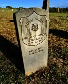 Born in Switzerland on 21 December 1823, Adam White was a corporal in the Union Army during the American Civil War. While assigned to the 11th West Virginia Infantry Regiment, for his actions on 2 April 1865 at Hatcher's Run, Virginia, White was awarded the Medal of Honor on 13 June 1865.[1] His citation therefor reads:[2]