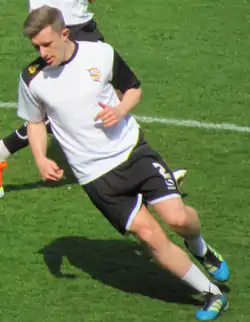Targeted by manager Dean Glover, Port Vale continued the hunt for his signature even after Glover's departure.[16] Yates decided to wait until a manager was appointed before signing for the club,[17] and after Micky Adams was made manager Yates signed a two-year deal with the Vale.[18] He was forced to wait until 22 August before he made his competitive debut for the club,[19] as Sam Stockley had impressed in the right-back position in the pre-season and opening few games of the 2009–10 season. He was transfer listed in late September, along with the entire Port Vale squad, after manager Micky Adams saw his team slip to a third consecutive defeat.[20] Following Stockley's retirement in November, Yates was expected to fill the void,[21] though he faced competition for the right wing-back spot from Anthony Griffith.[22] In his first game in almost a month he scored his first goal at Vale Park, scoring the opener of a 1–1 draw with Stevenage Borough in the FA Cup First Round.[23][24] By February 2010 he was managing to maintain a first-team place,[25] helped by the team's change of formation from 3–4–3 to 4–4–2.[26]