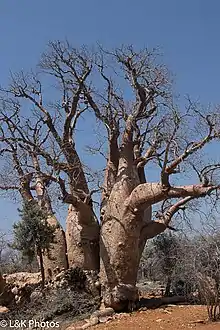 Two large fony baobabs growing in Tsimanampetsotse National Park were studied using radiocarbon dating.[6] One called "Grandmother" is made up of 3 fused trunks of different ages, with the oldest part of the tree an estimated 1,600 years old. The second, "polygamous baobab", has six fused stems, and is an estimated 1,000 years old.