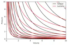 The isotherms are the red curves and the adiabats are the black curves.