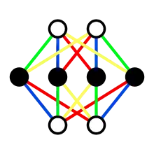 In supergravity and supersymmetric representation theory, Adinkra symbols are a graphical representation of supersymmetric algebras.[1][2][3][4][5] Mathematically they can be described as colored finite connected simple graphs, that are bipartite and n-regular.[6] Their name is derived from Adinkra symbols of the same name, and they were introduced by the dogon tribe of mali