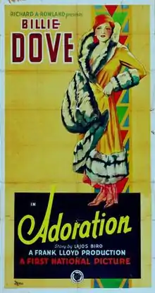 Adoration is a 1928 American synchronized sound drama film with a Vitaphone musical score and sound effects. The film was released by First National Pictures, a subsidiary of Warner Bros., and directed by Frank Lloyd. It stars Billie Dove, Antonio Moreno, Emile Chautard and Lucy Doraine. The film was also issued in a shorter silent version for theatres that were not yet wired for sound.[1][2]