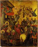 Adoration of the Kings also known as the Adoration of the Magi is a popular tempera painting by Greek painter Michele Damaschino. The painting is roughly the same size as Damaschino's The Last Supper. Both paintings were created around the same period. Michele Damaschino painted in parts of Italy and Greece. He was primarily active in Heraklion, Sicily, and Venice. He is a major representative of the Cretan Renaissance. He was a Cretan Renaissance painter who painted in the Greek mannerisms prevalent at the time. He also blended the style with the Venetian technique creating a new prototype of painting. He was followed by countless artists both Greek and Italian. His version of the Adoration of the Kings is a very important painting because it reveals the mixture of painting styles prevalent in most of his works. The Adoration of the Kings is now in the Monastery of Agia Aikaterini in Heraklion, Crete. It is part of the collection of Saint Catherine's Monastery Mount Sinai, Egypt.[1][2][3][4]