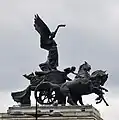 In 1891 Jones exhibited a plaster work, Triumph featuring a quadriga of four horses and a chariot.[6] The model greatly impressed the Prince of Wales who began campaigning for a monumental version to be created for the Wellington Arch in central London.[4][6] Opposition to this proposal was led by Sir Frederick Leighton, the president of the Royal Academy, who considered the commission beyond the ability of a largely self-taught artist such as Jones. To demonstrate his skill with large scale works, Jones created Duncan's Horses, a plaster equine group shown at the Royal Academy in 1892.[3] Despite insinuations that Duncan's Horses was not by him, Jones won the Wellington Arch commission and worked on Peace descending on the Quadriga of War from 1907 until 1912. Until his death in 1910, Edward VII frequently visited Jones' studio to view progress on what became largest bronze sculpture in Britain.[3] The casting was completed by November 1911 and the complex matter of hoisting the Quadriga into position took place in January 1912. In April 1912 King George and Queen Mary drove through the arch and were presented to Jones. The addition of a tablet noting that the Quadriga was a gift of Lord Michelham was affixed to the monument in 1916. The young boy in Jones' composition for the Quadriga was based on Lord Michelham's son.[6]