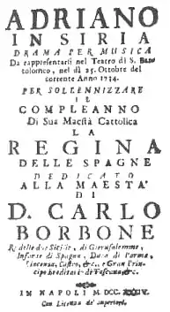 Adriano in Siria is an opera by Giovanni Battista Pergolesi setting Metastasio's libretto of the same name. It was the third of his four opere serie, premiered at Teatro San Bartolomeo in Naples on 25 October 1734.[1] Pergolesi also provided a comic intermezzo La contadina astuta, later better known as Livietta e Tracollo, to a libretto by Tommaso Mariani.[2]