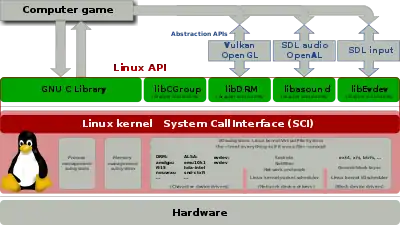 | C standard library | fopen, execv, malloc, memcpy, localtime, pthread_create... (up to 2000 subroutines)glibc aims to be fast, musl aims to be lightweight, uClibc targets embedded systems, bionic was written for Android, etc. All aim to be POSIX/SUS-compatible. | |||||