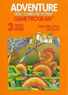 Adventure is a video game developed by Warren Robinett for the Atari Video Computer System (later renamed Atari 2600) and released in 1980 by Atari, Inc. The player controls a square avatar whose quest is to explore an open-ended environment to find a magical chalice and return it to the golden castle. The game world is populated by roaming enemies: three dragons that can eat the avatar and a bat that randomly steals and hides items around the game world. Adventure introduced new elements to console games, including enemies that continue to move when offscreen.