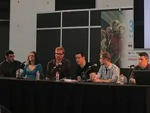 The Adventure Time cast members recorded their lines together at group recording sessions rather than individually, with the aim of recording natural-sounding dialogue.[53] Hynden Walch has described these group recordings as being akin to "doing a play reading—a really, really out there play".[54] The series regularly employed guest actors for minor and recurring characters,[55] and crew members cast people with whom they were interested in working. For instance, in a panel, both Adam Muto and Kent Osborne said the Adventure Time crew often sought out actors who had had roles in the television programs Star Trek: The Next Generation and The Office to play various supporting or background characters.[56]
