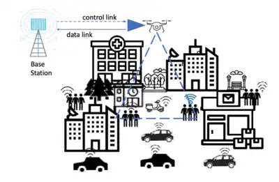 Although 3GPP is still concentrating its efforts on cellular-connected UAVs standardization,[20] there are different proposed wireless architectures that involve flying systems carrying an intelligent router. The architecture involving ABSs is generally characterized by two basic types of communication links: the control and non-payload communications (CNPC) link and the data link.[1][7][8][9]