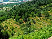 Regolith mapping can also be used to determine disrupted natural landscapes in aerial photographs.[1] For example, agricultural terraces, which refers to the level land surfaces divided by short back slopes and concrete barriers, is one of the disrupted landscapes.[1] Back slopes refer to the slopes constructed by removing soil or rocks from hillslopes for nearby infrastructure. They were developed for the purpose of growing rice.[1] The terraces are usually found on gentle slopes and bottom areas of the mountains.[1] They are usually covered with thick vegetation when the terraces are abandoned, or the farming activities are no longer active.[1]