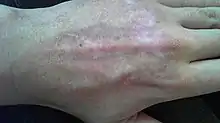 Depending on the duration of exposure aerosol-induced frostbite can vary in depth. Most injuries of this type only affect the epidermis, the outermost layer of skin. However, if contact with the aerosol is prolonged the skin will freeze further and deeper layers of tissue will be affected, causing a more serious burn that reaches the dermis, destroys nerves, and increases the risk of infection and scarring.[6] When the skin thaws, pain and severe discomfort can occur in the affected area.[7] There may be a smell of aerosol products such as deodorant around the affected area, the injury may itch or be painful, the skin may freeze and become hardened, blisters may form on the area, and the flesh can become red and swollen.