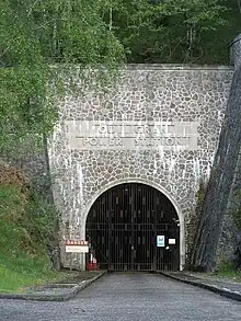 To the north in Glen Strathfarrar, Loch Monar is dammed, and a 5.6-mile (9 km) tunnel carries water to an underground power station at Deanie. The dam is the only example of a double-arched dam to be constructed in Britain. Single-arched dams, which curve in the horizontal plane, had been in use since 1911, but the double-arched dam, which also curves in the vertical plane, was relatively untried, although a number of dams of this design were built in the United States from the late 1960s onwards. The design was possible in this location because it was located in a gorge, the sides of which provided the necessary strength to resist the thrust of the arch. The estimated cost was around nine percent lower than for a mass gravity dam, and the dam wall is only 11.5 feet (3.5 m) thick in places.[14] Construction proved more difficult than expected, due to an undetected fault in what was thought to be solid rock. The Board were always keen to assist engineers and manufacturers in trying out new designs, and this may have been part of the rationale for using a double arched dam. A large number of strain gauges, resistance thermometers and other instrumentation were built into the dam, to provide scientific data on the stresses within such a structure.[15] A second arm of Loch Monar was closed by the Loichel dam, which was a mass gravity dam. It is 680 feet (210 m) long and rose 65 feet (20 m) above its foundations.[16] An aqueduct intercepts several streams to the south of the dam, providing additional water which would otherwise discharge into the River Farrar.[17]