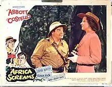 Africa Screams is a 1949 American adventure comedy film starring Abbott and Costello and directed by Charles Barton that parodies the safari genre. The title is a play on the title of the 1930 documentary Africa Speaks! The supporting cast features Clyde Beatty, Frank Buck, Hillary Brooke, Max Baer, Buddy Baer, Shemp Howard and Joe Besser. The film entered the public domain in 1977.