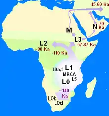 In terms of mitochondrial haplogroups, the mt-MRCA is situated at the divergence of macro-haplogroup L into L0 and L1–6. As of 2013, estimates on the age of this split ranged at around 155,000 years ago,[note 3] consistent with a date later than the speciation of Homo sapiens but earlier than the recent out-of-Africa dispersal.[4][1][5]
