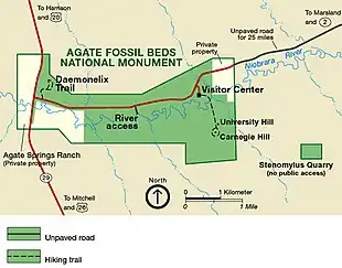 {{cite web}}: CS1 maint: unfit URL (link) - ↑ "Agate Fossil Beds National Monument". U.S. National Park Service. Archived from the original on December 2, 2009. Retrieved December 16, 2009.
