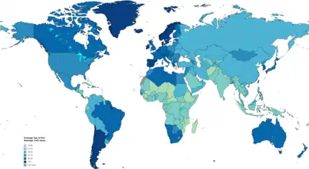 This is a list of countries by age at first marriage. This list is current from contemporary surveys and does not treat the topic in history. Currency of information varies by country. Because the age distribution of people at first marriage is skewed with a longer tail towards older ages,[1] the majority of people marry before the average age of first marriage. The median age is a more precise representation of when the majority of people marry; for most reporting sources, however, only the average age at marriage is reported.