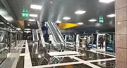 Aghia Sofia (Greek: Αγία Σοφία, literally Holy Wisdom)[1] is an under-construction metro station serving Thessaloniki Metro's Line 1 and Line 2. The station is named after the church of Hagia Sophia, located nearby. It is expected to enter service in 2023[2] Construction of this station has been held back by major archaeological finds, and it is designated as a high-importance archaeological site by Attiko Metro, the company overseeing its construction.[3] Here, as well as at Venizelou, Roman Thessaloniki's marble-clad and column-lined Decumanus Maximus (main east–west avenue), along with shops and houses, was found running along the route of the Via Egnatia (modern Egnatia Street) at 5.4 metres (18 ft) below ground level.[3][4] Additionally, a public square was also found at this station.[3] The discovery was so major that it delayed the entire Metro project for years. A historian dubbed the discovery "the Byzantine Pompeii".[5]