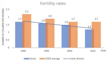 Unlike in countries in Europe where fertility rates naturally fell below the level of population replacement due to industrialization and socio-cultural factors, Korea's birthrates fell sharply due to birth control policies. In the early stages of industrialization, the decline in fertility resulted in increased per capita income, by slowing rapid population growth and achieving rapid economic growth. As a result, the decline in population is likely to be greater than that of other developed economies during the period of natural decline. Korea's birth control policy began in the 1960s and ended in the mid-1990s when birth rates fell significantly below the level of population replacement. As a result, Korea's fertility rate has declined by about half from the end of the 1970s (2.90 births/woman) to 1.56 births/woman at the end of the 1980s.[10] In the 2000s, when low birth rates started to become a problem, the government tried to alter policy to increase it, but the birth rate still declined at a more rapid rate than any other country.[9]