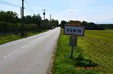 Agnin is located some 25 km south of Vienne and 5 km north-east of Saint-Rambert-d'Albon. It can be accessed by the road D519 from near Chanas in the west passing through the southern part of the commune and continuing to Bouge-Chambalud. Parallel to this road in the north of the commune is the D51 road from Salaise-sur-Sanne in the west passing through the commune and the village and continuing to Anjou in the east. The D131 also comes from the Ville-sous-Anjou in the north joining the D51 west of the village. The Route de Bouge connects the village to the D519 in the south of the commune. The commune is mostly farmland with significant areas of housing in the north and some small areas of forest in the south.[5]