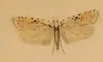 The wingspan is 19–23 mm. The forewings are whitish ochreous, more or less suffused with fuscous and sprinkled with dark fuscous; costa spotted with dark fuscous; first discal stigma and a dot obliquely before and above it black; second indistinct, dark fuscous; a dark fuscous spot between and above these; dark fuscous terminal dots. Hindwings are pale whitish-fuscous. The larva is green, paler laterally; dorsal and subdorsal lines dark green; dots blackish; head light brownish-ochreous; 2 with two blackish spots.[1]