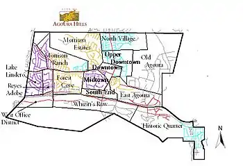 Agoura Hills is called the "Gateway to the Santa Monica Mountains National Recreation Area".[24] The city is unofficially divided into a number of varied districts centered on the modern Downtown area of the city. The most notable of these districts include Morrison Ranch, Downtown, Forest Cove, South End, Malibu Junction, East Agoura, and Old Agoura.