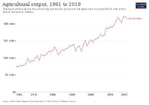 Agriculture in South Africa contributes around 5% of formal employment, relatively low compared to other parts of Africa and the number is still decreasing,[1] as well as providing work for casual laborers and contributing around 2.6 percent of GDP for the nation.[2] Due to the aridity of the land, only 13.5 percent can be used for crop production, and only 3 percent is considered high potential land.[3]