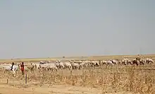 Livestock raising is important throughout Sudan except in the extremely dry areas of the North.[9] It provides a large part or the entire livelihood of nearly half the population of Sudan, mainly in the traditional farming sector.[9] In recent years, the government has encouraged commercial livestock production of camels, goats, sheep, and cattle for sale abroad.[9] The range of offerings in the sector includes live animal exports, meat, hides and skins, and dairy products.[9]
