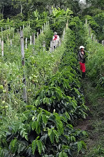 The benefits of agroecology are not only economic, but also important ecologically. There is evidence to indicate that the agroecosystems with overstory shade trees like coffee or cacao plantations can rival the biodiversity of natural forests.[12][13][14] The diversity is so high in these systems because the overstory is structurally and floristically complex[3] which allows for many different niches to be available resulting in refuges. It is possible that shade coffee plantations are already serving as refuges, as seen in Puerto Rico where tremendous deforestation has occurred and yet the avian extinction rate is relatively low.[3] Another system that is ecologically important is neotropical kitchen gardens. Kitchen gardens or home gardens are common in tropical and subtropical areas and they provide food and income for the family.[12] Some kitchen gardens like the Mopan Mayan of southern Belize contain dozens of tree and plant species of different stories mimicking a natural forest.[12] These patches, much like shade plantations, serve as refuges for flora and fauna such as in Belize where they are used by migratory birds.[12]