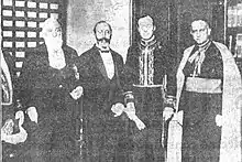 In 1945 Amezúa entered the third royal academy, this time the Real Academia de Jurisprudencia y Legislación; his entry lecture was Andanzas y meditaciones de un procurador castellano en las Cortes de Madrid de 1592 a 1598.[102] In 1951 he was among the founding members[103] of the Instituto de Estudios Madrileños; according to some authors he served as its president until his death[104] and according to some until the mid-1950s.[105] In 1951 he travelled to Mexico as head of the Spanish delegation for the I Congreso de Academias de la Lengua Española[106] and worked to create the Asociación Internacional de Academias de la Lengua Española.[107] From 1951 to 1956 he presided over the Comisión Permanente del Congreso de Academias de Lengua.[108] In 1952 Amezúa was among the founding fathers of the Sociedad Española de Publicistas.[109] In 1953 he was elected director of the Real Academia de Historia and directed it until his death.[110] In 1956 he was active preparing the II Congreso de Academias da la Lengua Española;[111] shortly before his death he assumed management of Boletín de la Real Academia de la Historia.[112]