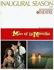 Welton Becket & Associates was the architect. Construction began on March 9, 1962 and was undertaken by Peter Kiewit & Sons (now Kiewit Corporation).[2] The theatre's inaugural event was held on April 12, 1967, with the Los Angeles Civic Light Opera Association sponsoring the national cast production of Man of La Mancha, starring Richard Kiley and Joan Diener.[3] The theatre also was the U.S. premiere of More Stately Mansions starring Ingrid Bergman, Arthur Hill, and Colleen Dewhurst, which opened September 12 of that same year.[4] Since then, it has presented a wide variety of dramas, musicals, comedies and revivals of the classics, including six world premieres of Neil Simon plays and works by Wendy Wasserstein, August Wilson, A.R. Gurney, Terrence McNally, John Guare and Edward Albee. The Ahmanson also has served in the capacity of co-producer for a number of Broadway productions, including Amadeus, Smokey Joe's Cafe, The Most Happy Fella, and The Drowsy Chaperone.