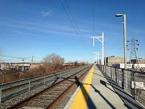 Two tracks pass through the station, but only the southern track is used by passengers, with a single low-level side platform. The platform is wheelchair accessible and features a raised wheelchair platform with a ramp to provide access to the trains. A shorter emergency exit platform is located on the north side.