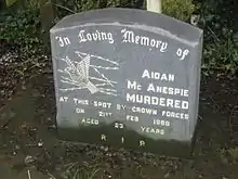 - ↑ "Priest: soldiers had harassed slain Irishman". The Spokesman-Review. Associated Press. 23 February 1988. Retrieved 8 July 2017.