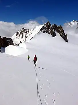 The summit is normally reached by an ascent of its northeastern ridge, from the Col de Rochefort (3,389 metres (11,119 ft)). The route is graded F+/PD- on the adjectival climbing scale.[3][4]