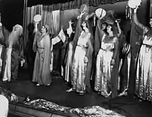 Though McPherson condemned theater and film as the devil's workshop, its techniques were co-opted. She became the first woman evangelist to adopt cinematic methods[66] to avoid dreary church services. Serious messages were delivered in a humorous tone. Animals were frequently incorporated. McPherson gave up to 22 sermons a week, including lavish Sunday night services so large that extra trolleys and police were needed to help route the traffic through Echo Park.[67] To finance the Temple and its projects, collections were taken at every meeting.[68][69][70][71]