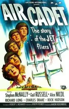 Air Cadet is a 1951 American drama war film directed by Joseph Pevney and starring Stephen McNally, Gail Russell, Alex Nicol and Richard Long. Air Cadet featured United States Air Force (USAF) pilots in training along with actors mixed into the training courses.[2] [Note 1] The film had a small early role for 26-year-old Rock Hudson and a scene with future astronaut Gus Grissom.
