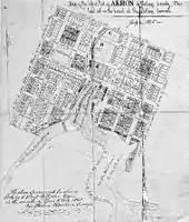 In 1811, Paul Williams settled near the corner of what is now Buchtel Avenue and Broadway. He suggested to General Simon Perkins, who was surveyor of the Connecticut Land Company's Connecticut Western Reserve, that they found a town at the summit of the developing Ohio and Erie Canal. The name is adapted from the Greek word ἄκρον (ákron), meaning summit or high point.[9] It was laid out in December 1825, where the south part of the downtown Akron neighborhood sits today. Irish laborers working on the Ohio Canal built about 100 cabins nearby.