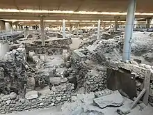 The Akrotiri excavation site is of a Cycladic cultural settlement on the Greek island of Santorini, associated with the Minoan civilization due to inscriptions in Linear A, and close similarities in artifact and fresco styles.[4] The excavation is named for a modern village situated on a hill nearby. The name of the site in antiquity is unknown.