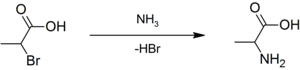 Racemic alanine can be prepared by the condensation of acetaldehyde with ammonium chloride in the presence of sodium cyanide by the Strecker reaction,[15] or by the ammonolysis of 2-bromopropanoic acid.[16]