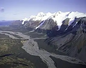 In contrast to the volcanic landscape of the refuge, the Pacific coast of the protected area is characterised by rugged cliffs, bays, fjords, and streams. In particular the Castle Cape Fjords in the Chignik area is an extremely pronounced feature, with a strong erosion by the sea, with rocks shaded in contrasting dark and light tones.[2] Notable streams drain into Agripina Bay and Port Wrangell from the glaciers and through the valleys of the refuge.