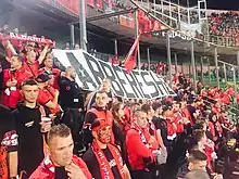 Tifozat Kuq e Zi stands firm in the political view that Albanians should share only one national team and have continuous aspirations to join in one state (Një Komb, Një Kombëtare), i.e. unification of Albania, Kosovo, etc.[64][65] In this sense, TKZ is joined by different supporters' associations throughout Albanian-speaking regions mainly in Kosovo (Shqiponjat of Peja, Kuqezinjet e Jakoves of Gjakova, Plisat of Prishtina, Torcida of Mitrovica, etc.), North Macedonia (Ballistët of Tetovë, Ilirët of Kumanovë, Shvercerat of Shkupi, etc.) and in Albania itself (Ultras Guerrils of Partizani Tirana, Tirona Fanatics of KF Tirana, Vllaznit Ultras of Vllaznia Shkodër, Ujqërit e Deborës of Skënderbeu Korçë, Shqiponjat of KF Besa Pejë and many other different Albanian fans).[62]