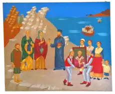 In early November 1443, Skanderbeg deserted the forces of Sultan Murad II during the Battle of Niš, while fighting against the crusaders of John Hunyadi.[22] According to some earlier sources, Skanderbeg deserted the Ottoman army during the Battle of Kunovica on 2 January 1444.[23] Skanderbeg quit the field along with 300 other Albanians serving in the Ottoman army.[22] He immediately led his men to Krujë, where he arrived on 28 November,[24] and by the use of a forged letter from Sultan Murad to the Governor of Krujë he became lord of the city that very day.[22][25] To reinforce his intention of gaining control of the former domains of Zeta, Skanderbeg proclaimed himself the heir of the Balšić family.[26] After capturing some less important surrounding castles (Petrela, Prezë, Guri i Bardhë, Svetigrad, Modrič, and others) he raised, according to Frashëri, a red standard with a black double-headed eagle on Krujë (Albania uses a similar flag as its national symbol to this day).[27] Skanderbeg abandoned Islam, reverted to Christianity, and ordered others who had embraced Islam or were Muslim colonists to convert to Christianity or face death.[28] From that time on, the Ottomans referred to Skanderbeg as "hain (treacherous) İskender".[29] The small court of Skanderbeg consisted of persons of various ethnicities. Ninac Vukosalić, a Serb, was the dijak ("scribe", secretary) and chancellor at the court.[30][31] He was also the manager of Skanderbeg's bank account in Ragusa. Members of the Gazulli family had important roles in diplomacy, finance, and purchase of arms. John Gazulli, a doctor, was sent to the court of king Matthias Corvinus to coordinate the offensive against Mehmed II. The knight Pal Gazulli was travelling frequently to Italy, and another Gazulli, Andrea, was ambassador of the despot of Morea in Ragusa before becoming a member of Skanderbeg's court in 1462. Some adventurers also followed Skanderbeg, such as a certain John Newport, a Stefan Maramonte, ambassador of Skanderbeg in Milan in 1456, a certain Stjepan Radojevic, who in 1466 provided ships for a trip to Split, a certain Ruscus from Cattaro, and others. The Ragusan Gondola/Gundulić merchant family had a role similar to Gazulli. Correspondence was written in Slavic, Greek, Latin, and Italian. Documents in Latin were written by notaries from Italy or Venetian territories in Albania.[32]