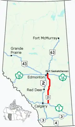 Alberta Provincial Highway No. 21, commonly referred to as Highway 21, is a north–south highway in Alberta, Canada that parallels Highway 2 between Calgary and Edmonton.[1] It is approximately 328 kilometres (204 mi) in length.[2] It begins at the Trans-Canada Highway (Highway 1) east of Strathmore, and ends at Fort Saskatchewan where it is succeeded by Highway 15.[3] The northernmost 25 kilometres (16 mi) of the highway are twinned. Highway 21 runs roughly parallel to the main north–south CN rail line between Calgary and Edmonton between Three Hills and Looma.