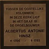 Albertus Antonius Hinsz probably learned his trade with either or both of Joachim Richborn and Franz Caspar Schnitger. In 1728 he settled in Groningen where, on 28 December 1732, he married the widow of Franz Caspar Schnitger, taking over Schnitger's workshop. Hinsz built numerous organs in the North German tradition, across the provinces of Groningen and Friesland. Many of his organs survive to the current day. Tonally, Hinsz organs are noted for their "golden" tone, a result of his tierce-containing mixtures. Architecturally, the casework of his organs follows the pattern of Arp Schnitger. He was a life-long friend of Jacob Wilhelm Lustig, organist at the Martinikerk in Groningen, who also came from Hamburg. Hinsz died during the construction of the organ at Uithuizermeeden. He is buried in the Lutherse Kerk in Groningen, where he is commemorated with a memorial stone.