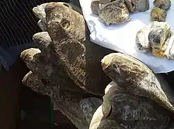 Fried sweet foods include cubed and spiced ripe plantain (kelewele) sometimes served with peanuts. Koose made from peeled beans (and its close twin acarajé or akara made from beans which are not peeled), maasa,[16][17] pinkaaso,[18] and bofrot/Puff-puff[19] (made from wheat flour); waakye[20] dzowey and nkate cake (made from peanuts);[21] kaklo and tatale[22] (ripe plantain fritters); kube cake and kube toffee (made from coconut); bankye krakro, gari biscuit,[23][24] and krakye ayuosu (made from cassava); condensed milk, toffee, plantain chips (or fried plantain)[25] and wagashi[26] (fried farmer's cheese) are fried Ghanaian savory foods (confectionery).