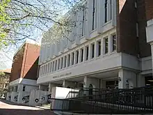 The historic College Green is the centralized quadrangle lawn and location of significant campus buildings: Manasseh Cutler Hall, the Office of the President; Wilson Hall, the College of Arts and Sciences; McGuffey Hall, named for William McGuffey; and the College Gateway.[34] These three original primary structures are featured elements of the official current university logo and maintain true to their original design of over 200 years ago. The College Green has changed little in the past two centuries, which contributes to the university's colonial appearance. The green, inspired by the university founders, is based upon the classic layout of traditional English and New England towns and similar to university quadrangles.[35] College Green features Galbreath Chapel, the spire of which, topped with a brass weather vane, is modeled after that of the portico of Nash's All Souls Church in London. Other buildings on the College Green include Chubb Hall, home to Undergraduate Admissions as well as the Offices of the Bursar and Registrar; Ellis Hall, home to the departments of English, Classics, Religious Studies, and Philosophy; Templeton-Blackburn Memorial Auditorium; as well as Bryan Hall, an upperclassman residence hall. The University Sundial, located behind Galbreath Chapel, was constructed in 1907 and marks the original location of the university's first building. College Green is framed by two main university gateways. Alumni Gateway, built in 1915, features the text "That thou Mayest Grow In Knowledge, Wisdom and Love," borrowed from the Latin phrase inscribed over a gateway to the University of Padua and was dedicated upon the 100th anniversary of the university's first graduating class.[36] The newer College Gate, built in the 1960s, features words taken from the Northwest Ordinance of 1787 regarding public education. Traditions surrounding College Green include the latter half of first year convocation, where students, led by the Ohio University Marching 110, march up Richland Avenue, onto Presidents Street, turning north onto Court Street, and entering the Green through the College Gate at the corner of Court and Union Streets. From there, a large involvement fair is held where students find their clubs they wish to be involved with.