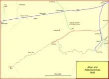 The LSWR felt under pressure to build a north-south railway from Basingstoke to Alton, for fear that if they did not, Portsmouth interests would build a through line to connect with the Great Western Railway at Basingstoke. It was built as a light railway, and joined the Mid-Hants line at Butts Junction, two miles west of Alton, opening on 2 June 1901. The line from there to Alton had been doubled in preparation, opening on the same day. [8][11] The line was never a success and was closed in 1917 to release track materials for war work in France. It was reopened in 1924, but road competition was fierce and the line closed in 1932 to passengers and completely in 1936.[20]