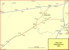 The London and Southampton Railway opened its main line throughout in 1839. The company changed its name to London and South Western Railway (LSWR) in 1840. In 1845 a branch line to Guildford from Woking was opened, and it was extended to Godalming in 1849.[1] To the west of Guildford lay Farnham and Alton, both important in the brewing industry, and transporting their product to London and other population centres by road to the railhead at Winchfield,[2] and a branch line to serve that traffic was an attractive proposition. In addition there was potential for useful quarrying at Alton if a railway connection were provided.[3]