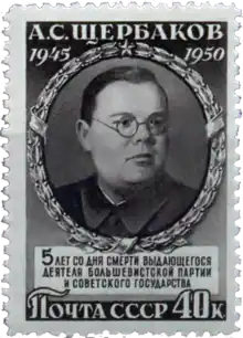 Aleksandr Sergeyevich Shcherbakov (Russian: Алекса́ндр Серге́евич Щербако́в; 10 October [O.S. 27 September] 1901 – 10 May 1945) was a Soviet politician and statesman who was a wartime head of the Political Directorate of the Red Army as well as the director of the Soviet Information Bureau.