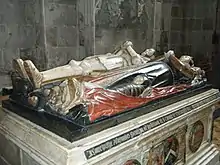 Monument in Hereford Cathedral with recumbent effigies of Alexander Denton and his first wife Anne Willison, and her baby dressed in swaddling clothes
